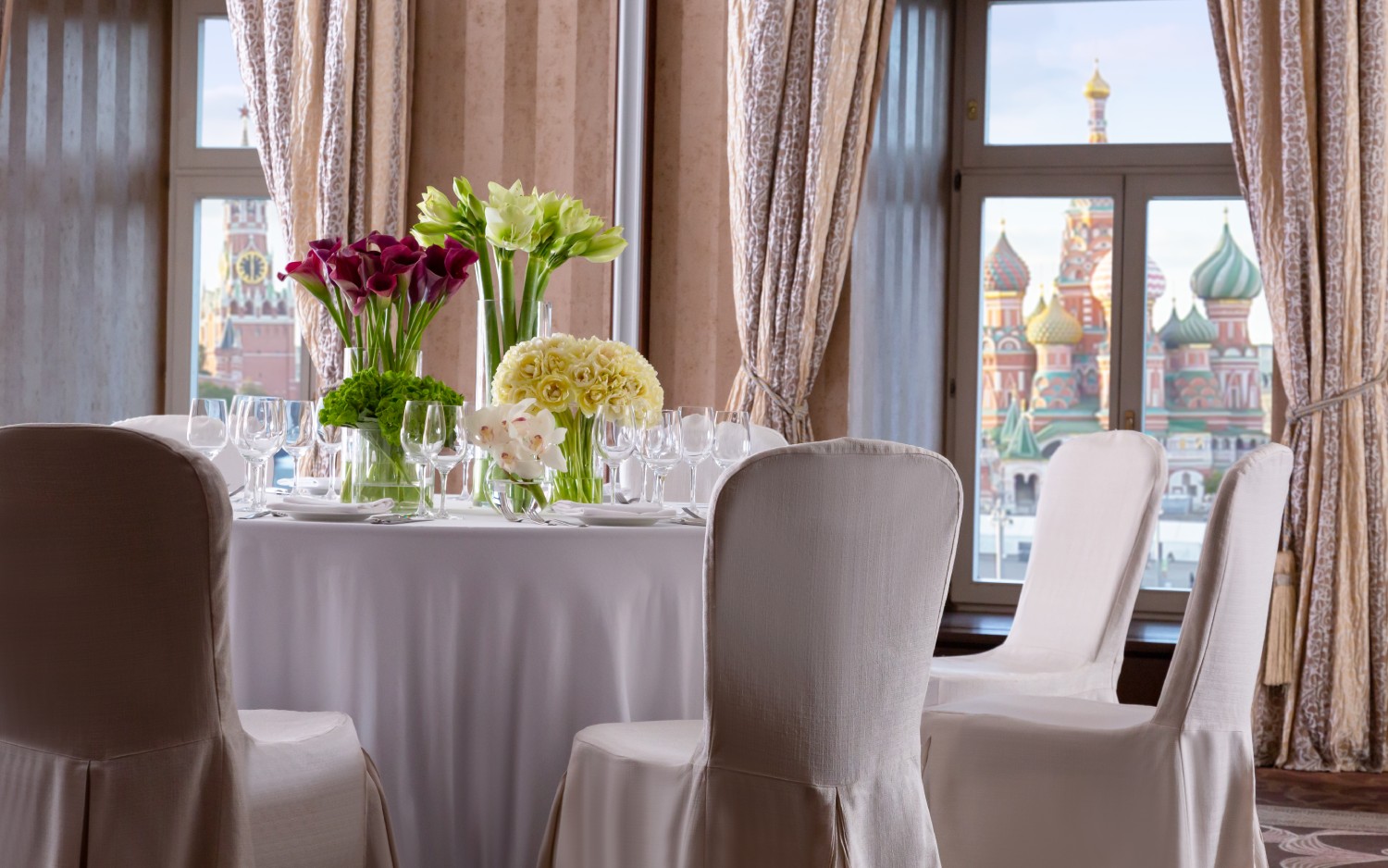 Мы не просто предоставляем залы — мы помогаем воплотить историю пары. Например, можем предложить необычные зоны для торжества: просторный Атриум со стеклянным потолком или зал «Библиотека» с балконом, с которого открывается панорамный вид на Кремль, Красную площадь и храм Василия Блаженного. Можем по желанию пары организовать тематический фуршет с блюдами кухни разных стран, если пара любит путешествовать. И, конечно, неотъемлемая часть любого мероприятия в отеле — это безупречный сервис по стандартам Kempinski.